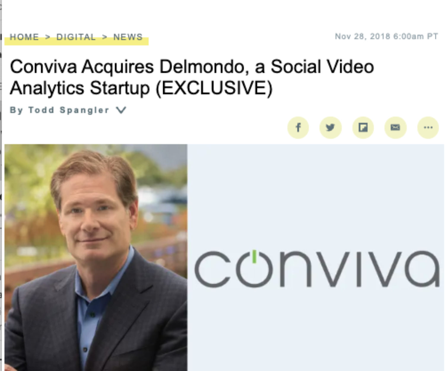 Uncategorized 12 Dec 2023 Variety – Conviva Acquires Delmondo, a Social Video Analytics Startup Conviva, which delivers real-time measurement of premium streaming video, is digging into the social scene with the acquisition of Delmondo. Delmondo,… Nick Cicero